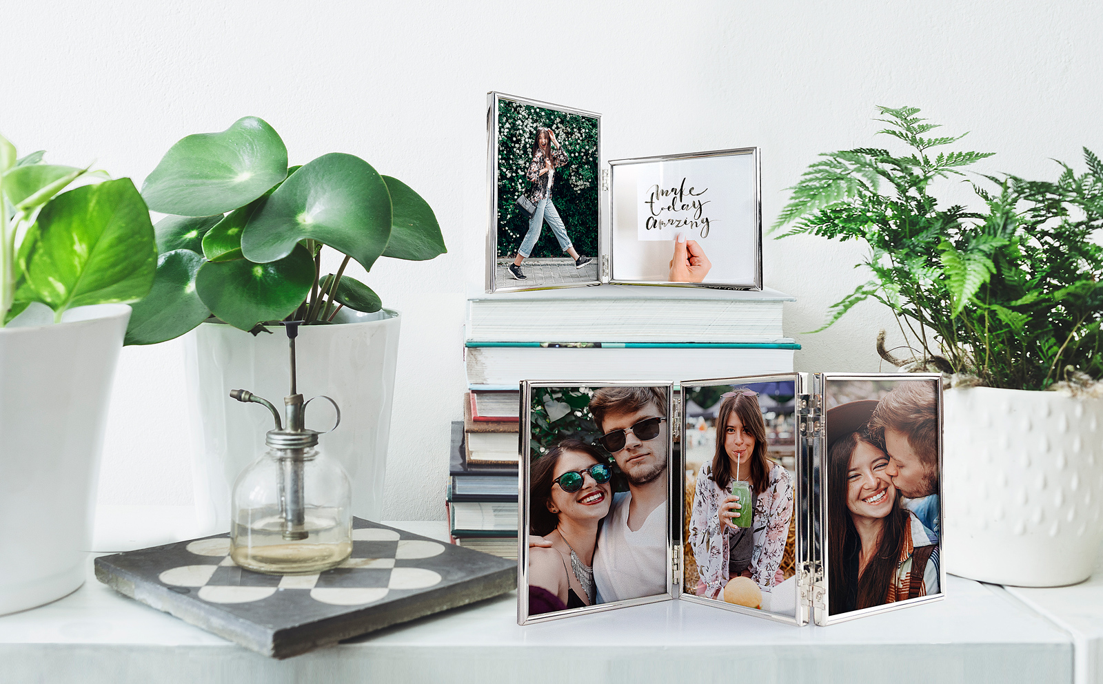 Der edle Rahmen ist in verschiedenen Ausführungen erhältlich, zum Aufhängen oder in den kleineren Formaten auch zum Aufstellen als Einfach-, Zweifach- oder Dreifach-Rahmen.