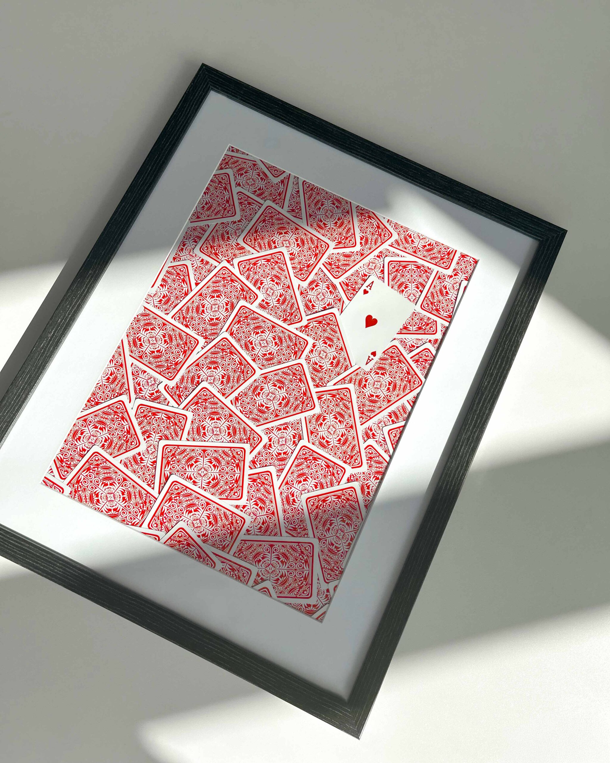 Außerdem sieht das nicht nur sehr dekorativ aus, sondern zeigt auch, dass Du ein kreativer Mensch mit liebevollen Ideen bist. Klebe die Spielkarten flächendeckend einfach wild durcheinander mit der Rückseite nach oben zeigend auf einen passenden Fotokarton. Nur das „Ass“ oder wahlweise eine der Bildkarten zeigen mit dem Bild nach oben. Das sagt doch alles!