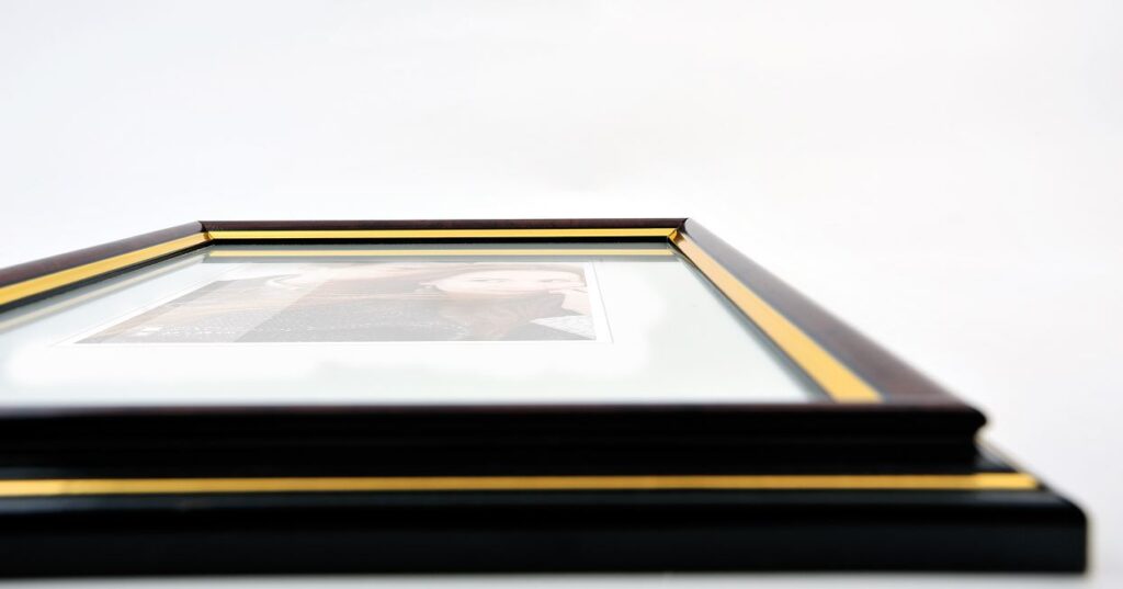 Das mehrfach gekehlte Profil mit glänzender Oberfläche in Wurzelholzoptik und einer innenliegenden Doppel-Goldkante macht den Rahmen besonders edel. SMELL ist in verschiedenen Formaten in unserem Onlineshop erhältlich.
