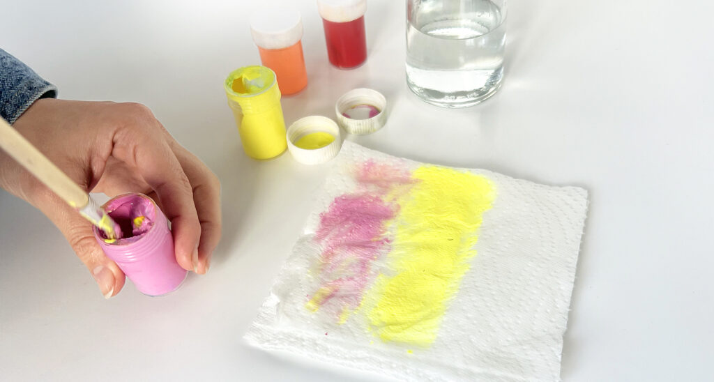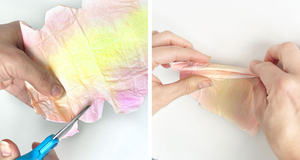 Zuerst schneidest Du aus dem Küchenpapier Quadrate zurecht. Für eine Blume solltest Du etwa vier bis sechs Lagen übereinanderlegen. Befeuchte den Stapel mit Wasser und tupfe anschließend Farbe darauf – ruhig unregelmäßig, so entstehen später schöne Farbverläufe. Falte das Papier kurz zusammen und drücke überschüssige Flüssigkeit vorsichtig aus. Danach wieder auffalten und vollständig trocknen lassen.